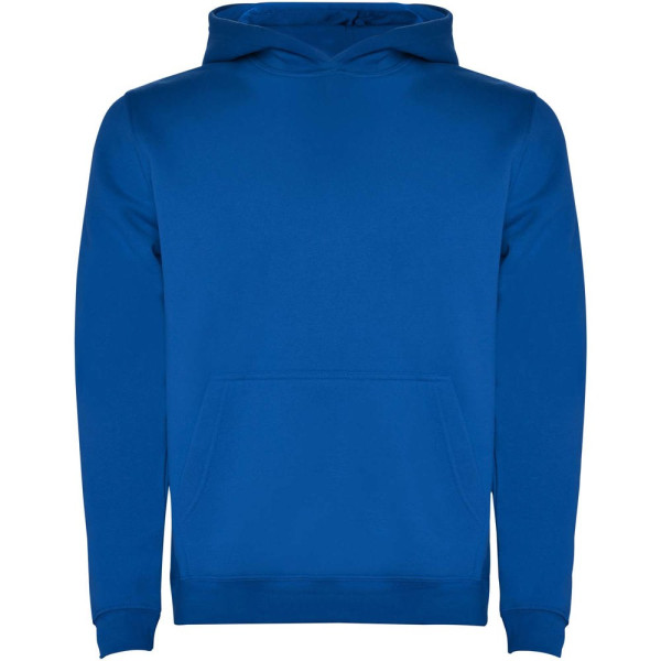 Zweifarbiger Kapuzenpullover mit doppeltem Stoff. Verstärkte und verdeckte Nähte am Kragen und an der Kängurutasche. Elastischer 1×1-Rippstrick an Ärmeln und Bund. Herausnehmbares Etikett. Das Modell ist 120 cm groß und trägt Größe 5/6.