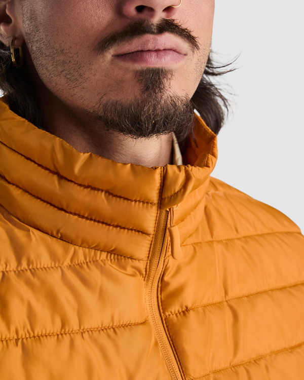 Wasserdichte gepolsterte Weste. farblich invertierter Frontreißverschluss mit Kinnschutz aus demselben Stoff. Seitentaschen mit farblich umgekehrten Reißverschlüssen in den Seitenteilen. Farblich umgekehrte, elastische Paspeln an Armausschnitten und Saum. Futter in Vollton- und Kontrastfarben.