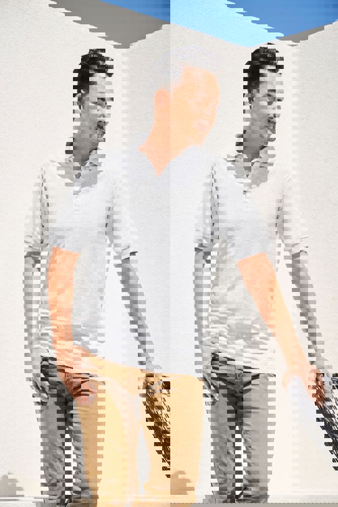 50% vorgeschrumpfte Baumwolle / 50% Polyester DryBlend®. Rippstrickkragen. Thermo-Transfer-Label. Mischgewebe Jersey Polo. 3er-Knopfleiste mit Ton-in-Ton Knöpfen. Ärmelabschluss in Feinripp. Doppelnaht am Saum.
