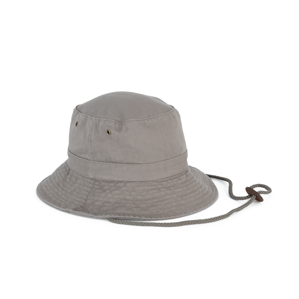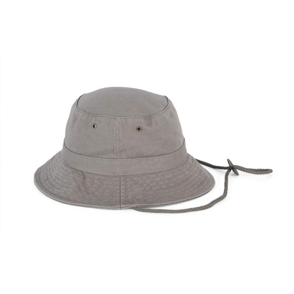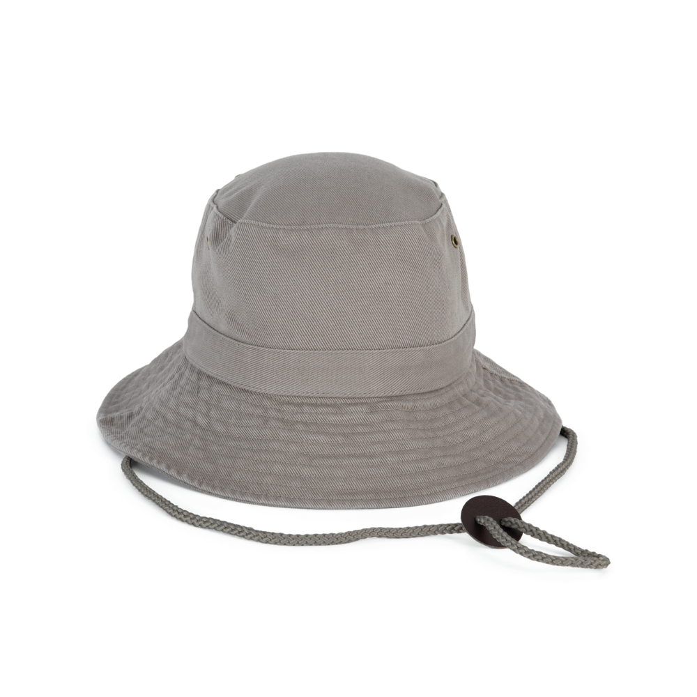 100% grob gebürstetes Baumwolltwill, fest und dicht. Doppelt gesteppter Rand. Krempe verstärkt. Schnur aus Leder, mit Stopper zum Einstellen. 4 Metall-Luftösen.