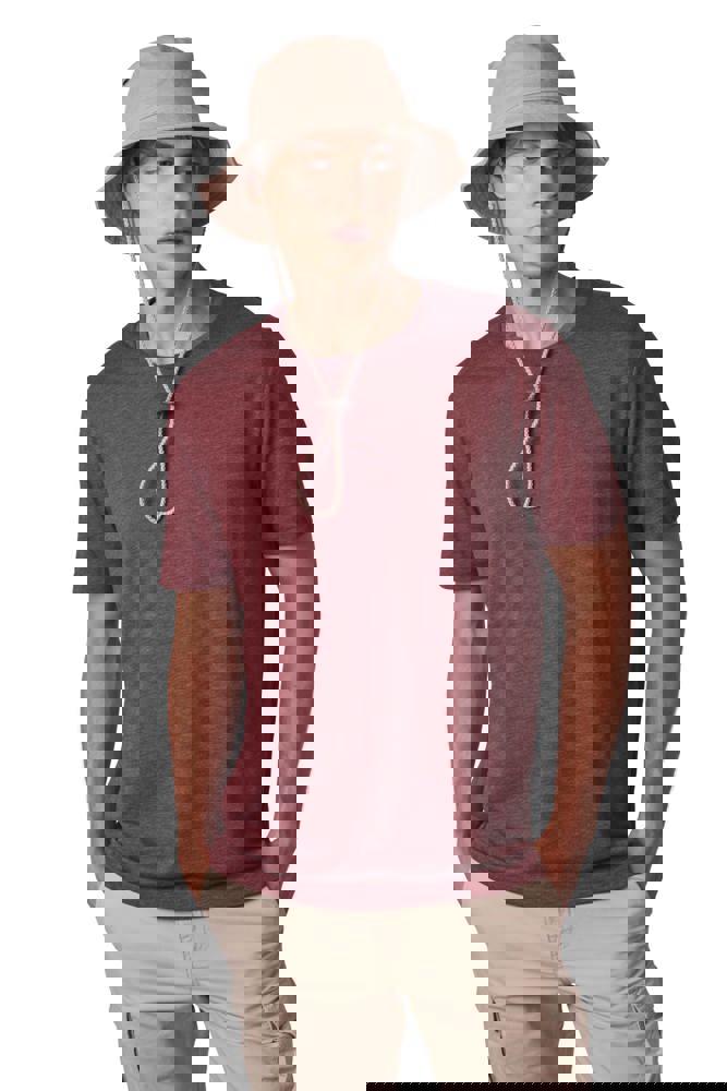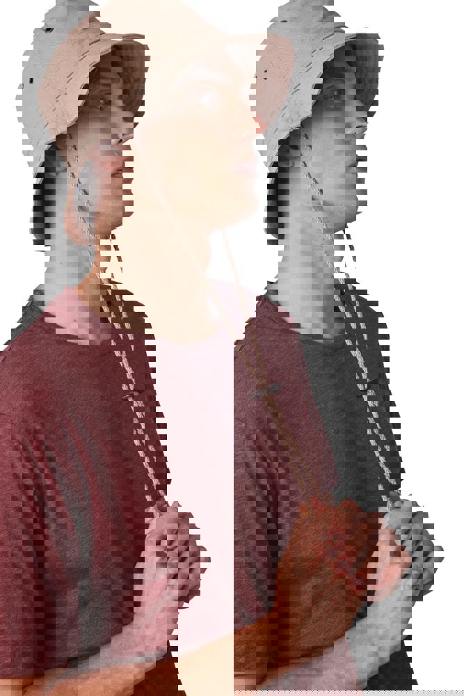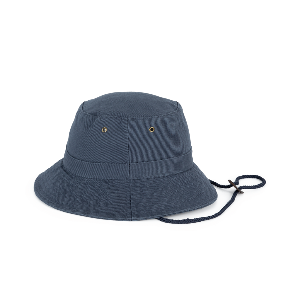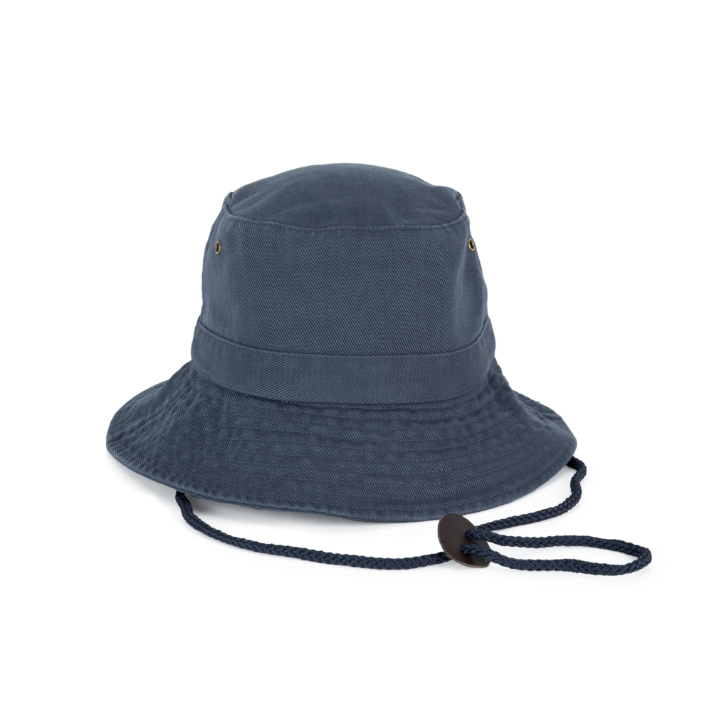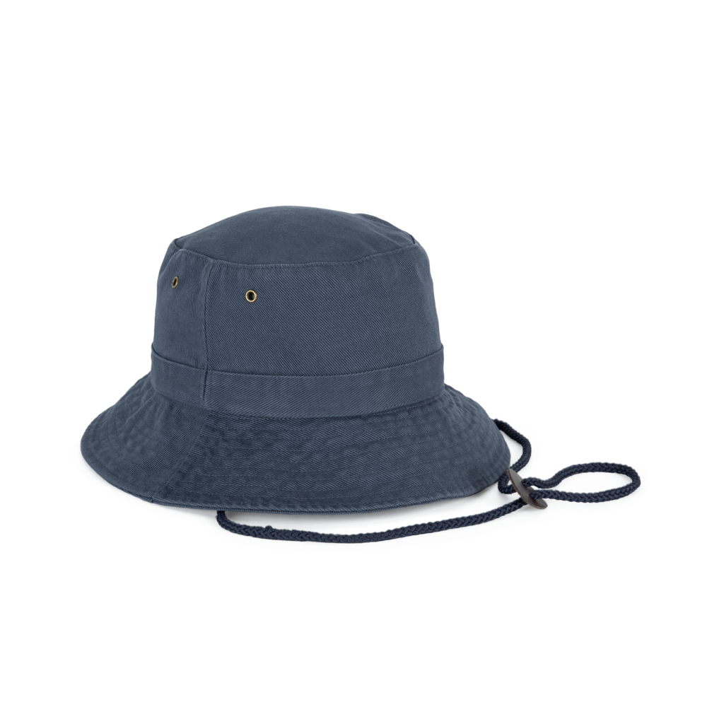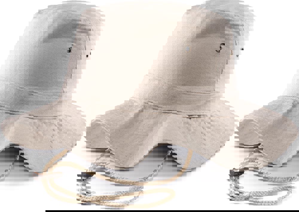 100% grob gebürstetes Baumwolltwill, fest und dicht. Doppelt gesteppter Rand. Krempe verstärkt. Schnur aus Leder, mit Stopper zum Einstellen. 4 Metall-Luftösen.