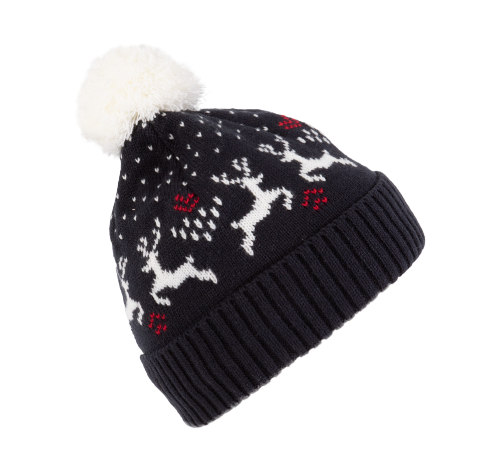 100 % Acryl. Rand 100% Polyester. Mütze mit dekorativem Rentier-Motiv