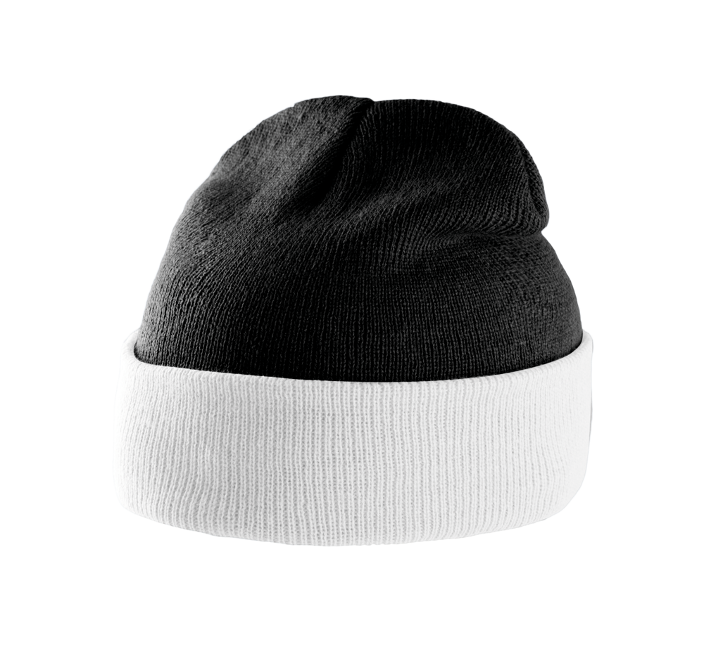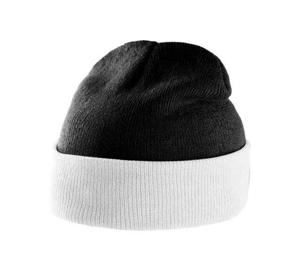 100% Acryl. Modische Mütze mit gestricktem Umschlag in Kontrastfarbe.