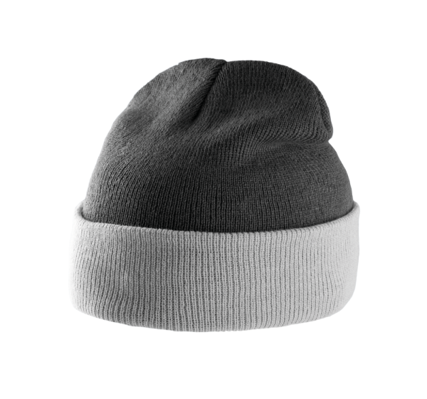 100% Acryl. Modische Mütze mit gestricktem Umschlag in Kontrastfarbe.