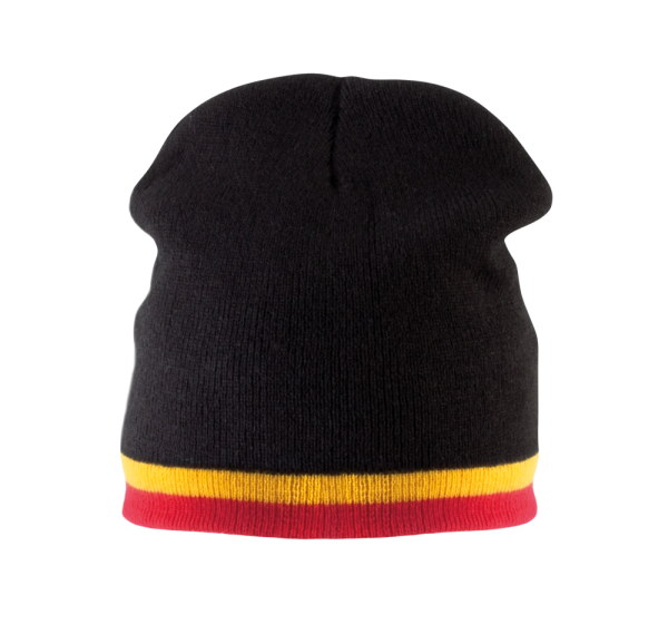 100% Acryl. Strickmütze mit Kontraststreifen am Rand.
