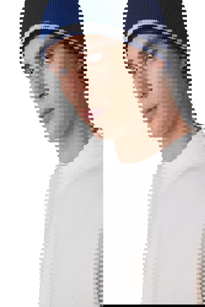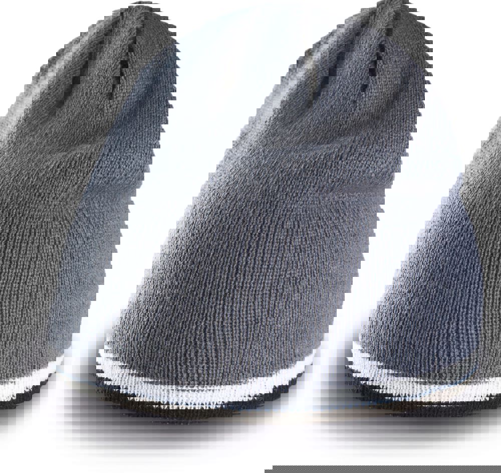 100% Acryl. Strickmütze mit Kontraststreifen am Rand.