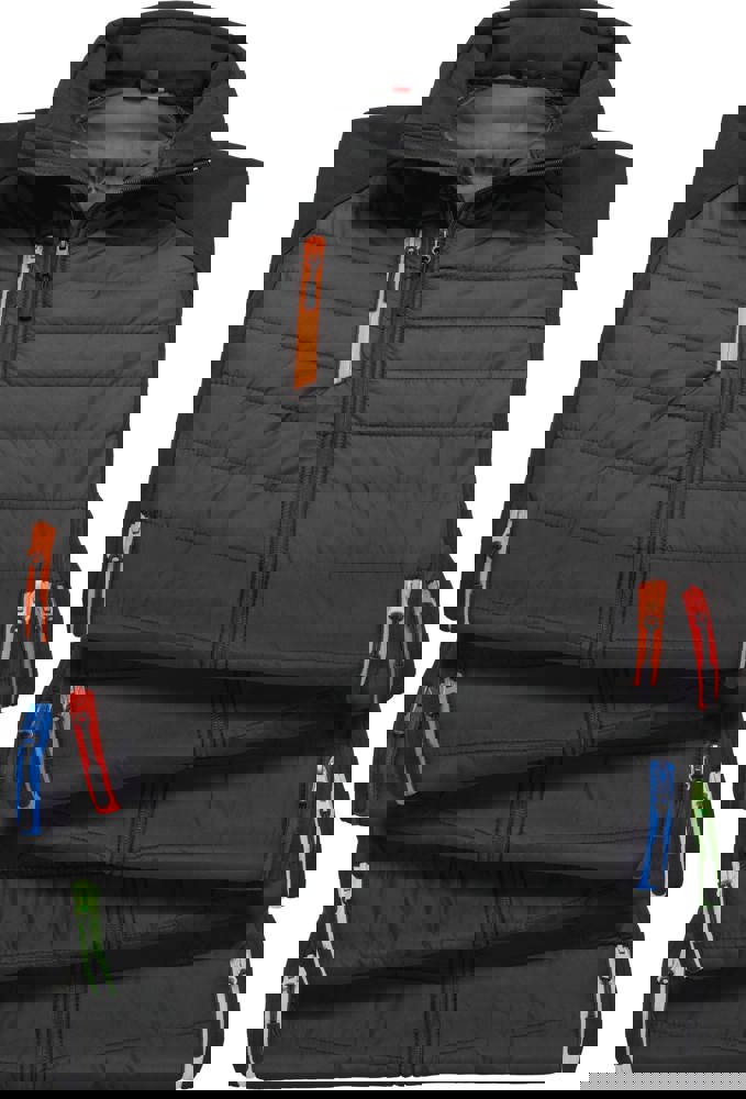 Körperbereich: Außenmaterial: 100% JIAREN recyceltes Polyester 180g/m² Polyester Innenfutter: 100% Polyester. Durchgehender Reißverschluss vorne mit Kinnschutz. Gepolsterter Stehkragen. Kontrastfarbene Details an Brust-und Seitentaschen mit schwarze mReißverschlussschieber. Wattierter, gesteppter Körperbereich. Eingefasste, weiche Bündchen. Sehr weich, leicht und warm. Veredelungszugang: verdeckter Reißverschluss im Brustbereich links.