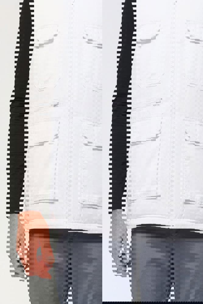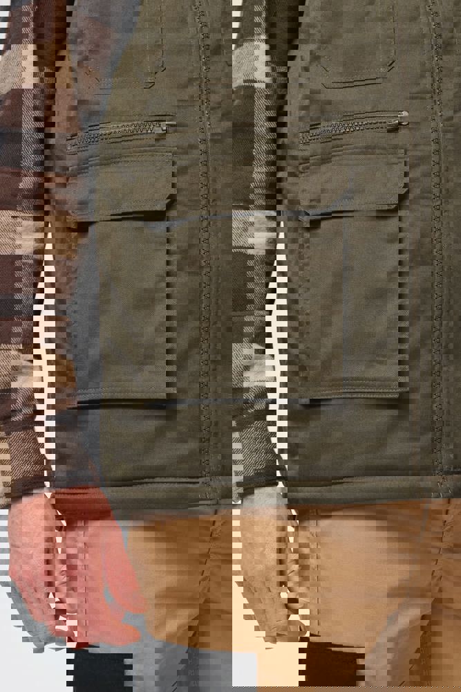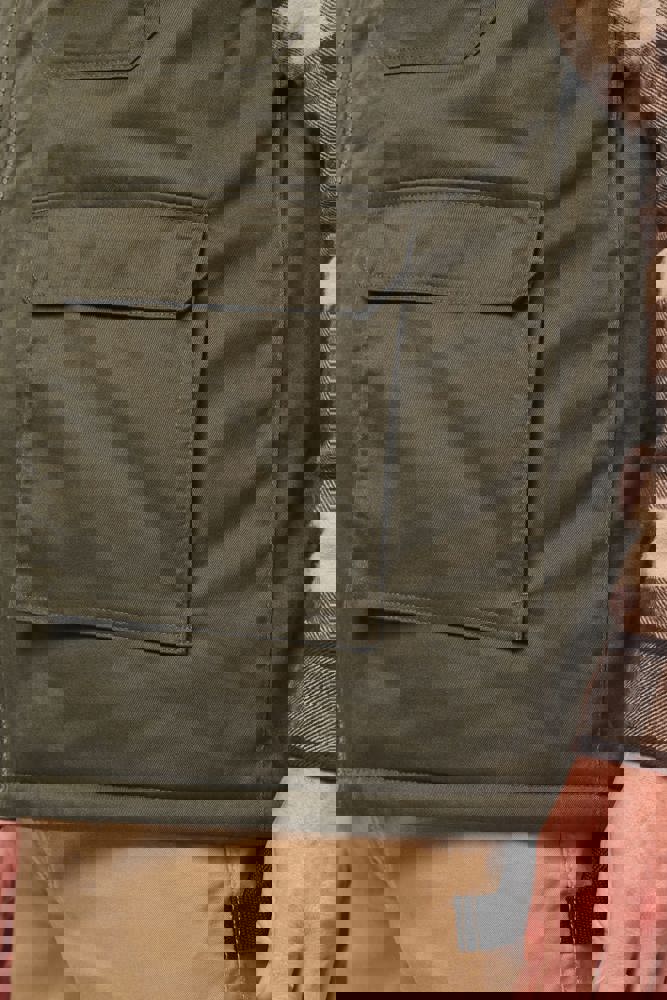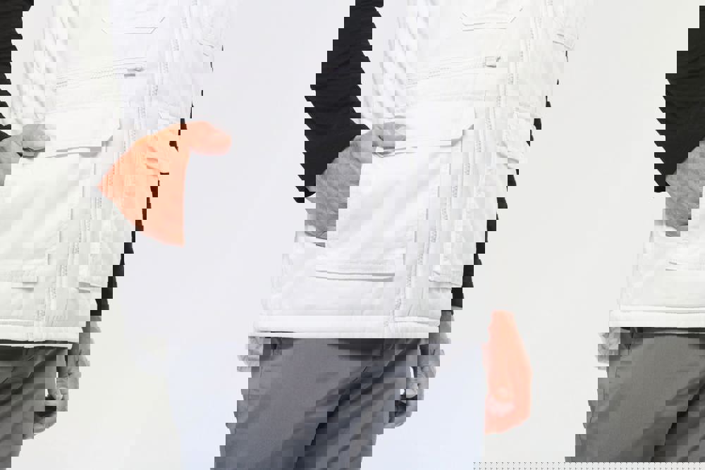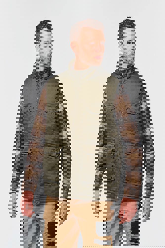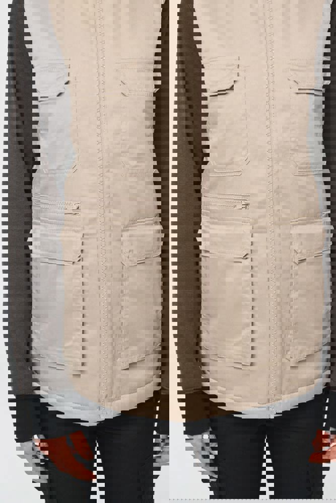 Außenseite: 65 % Polyester/35 % Baumwolle. 100 % Polyester-Innenseite. Innenfutter: 100 % Polyester. Gerader Schnitt. 2 große aufgesetzt Taschen mit Klappe und Klettverschluss sowie seitlicher Öffnung sowie 2 aufgesetzt Brusttaschen mit Klappe und Klettverschluss, davon eine mit einem offenen Stiftfach. 1 Tasche mit farblich abgestimmtem Reißverschluss auf der Vorderseite rechts. 1 Innentasche mit Klettverschlussband auf der Brust. Farblich abgestimmtem Kunststoff-Reißverschluss. Befestigungshaken auf der Krageninnenseite. Verlängerter Rücken. Unsichtbarer Reißverschluss zur Veredelung am Saum. Markenetikett zum Abreißen.