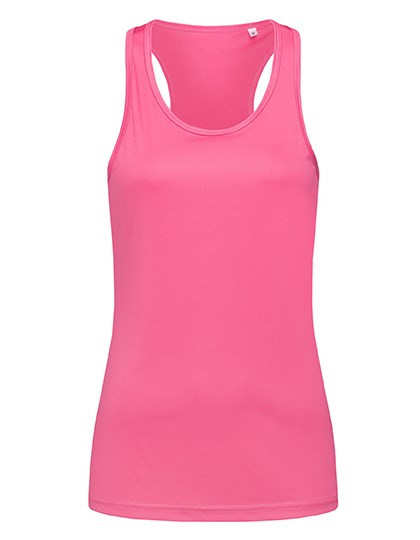 Racerback-Rücken | Halsausschnitt und Armlöcher eingefasst | Weiches und leicht glänzendes Material | Kleines, reflektierendes ACTIVE-DRY°-Logo auf der Rückseite | Kleines Größenetikett im Nacken | Pflegeetikett in der Seitennaht | Seitennähte | Waschbar bis 40 °C | Körperbetonte Passform
