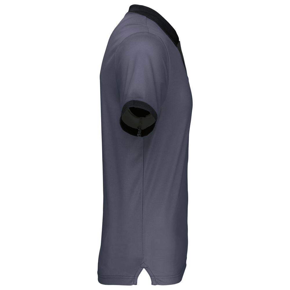 100 % Cool Plus® Polyesterpiqué. Gerader Schnitt. Kontrastfarbenes Rippstrickbündchen an Kragen und Ärmelsaum. Knopfleiste mit 3 Knöpfen (je nach Modell kontrastierend oder einfarbig). Seitliche Schlitze.
