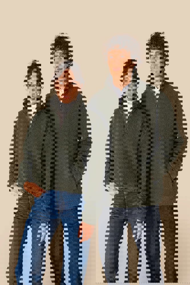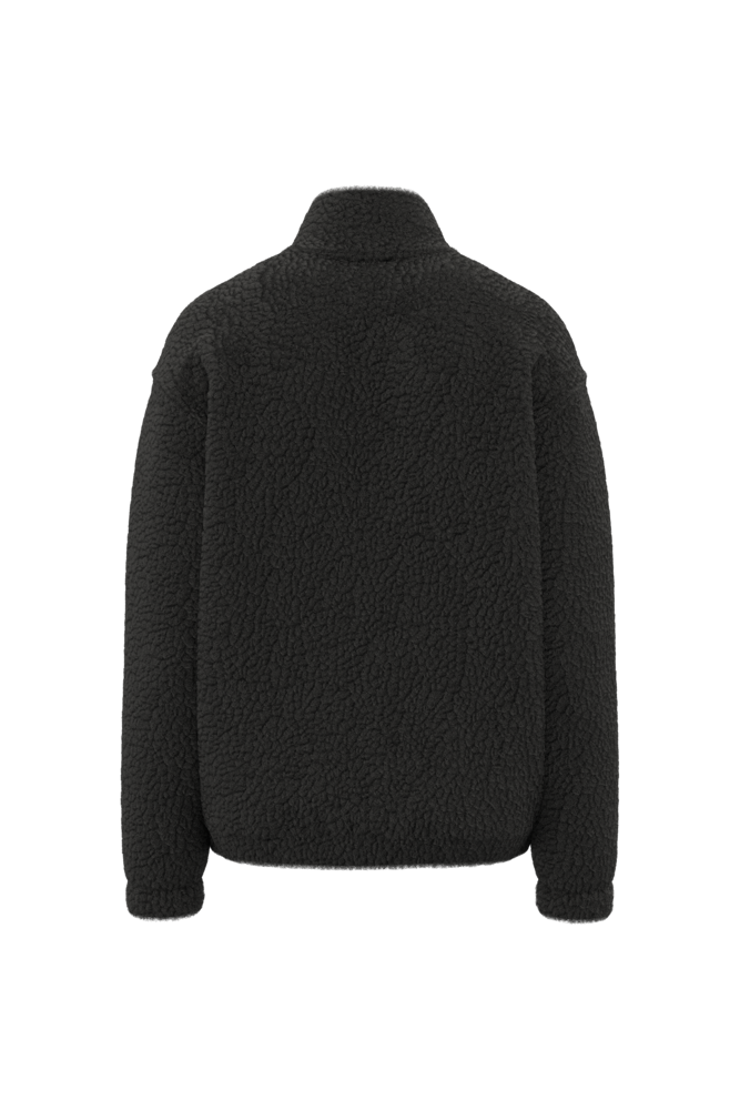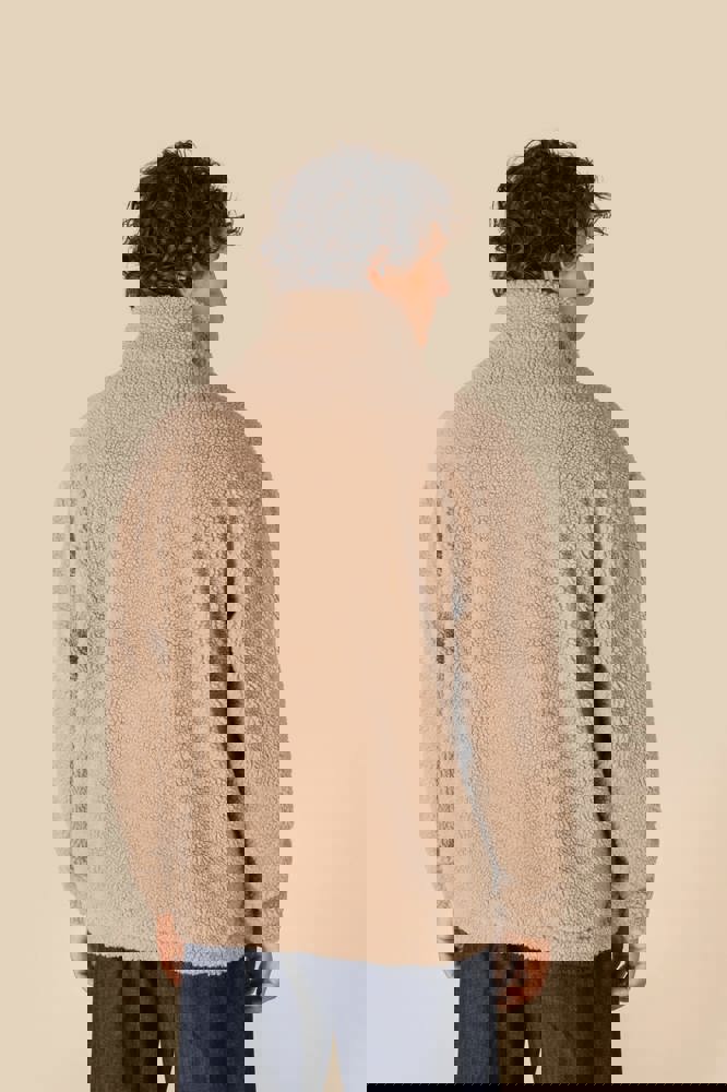 100 % Polyester. Reguläre Passform mit überschnittener Schulterpartie. Sherpa-Material mit Hauptfutter aus Jersey und Ärmelfutter aus Taft für ein einfaches Anziehen. Ein mit Hauptmaterial gefütterter Stehkragen mit Reißverschluss und einem Ton-in-Ton-Metallschieber. Krageninnenseite mit Nackenband mit tonalem Fischgrätenmuster. Elastische Ärmelbündchen und Saum. Zwei paspelierte Taschen auf der Vorderseite. Reißverschluss zur individuellen Veredelung am unteren Rand des Kleidungsstücks.