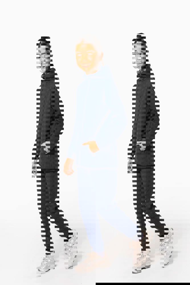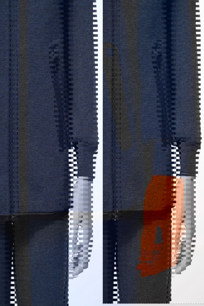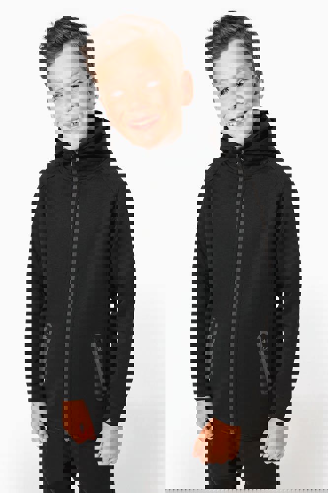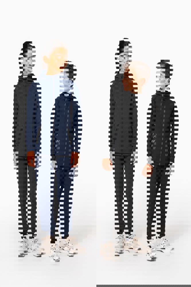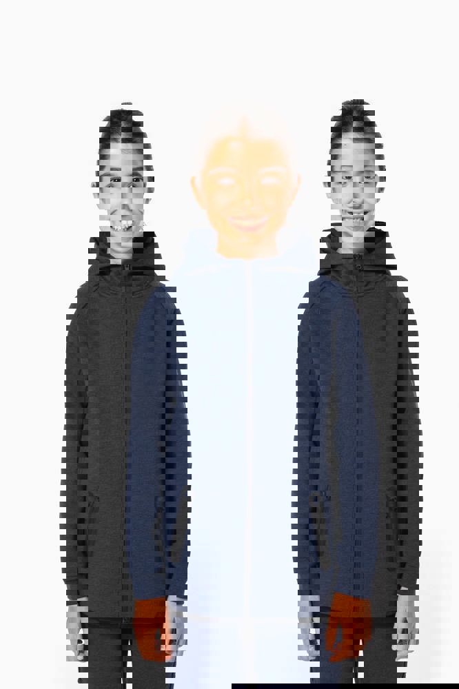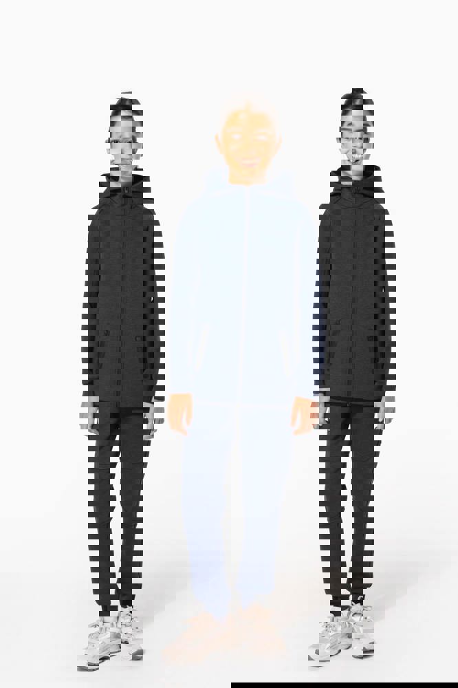 94% Polyester / 6% Elasthan (79% Polyester / 15% Viskose / 6% Elasthan bei der melierten Farbe). Ultrabequemes Material. Gerader Schnitt. Reißverschluss. 2 Vordertaschen mit Reißverschluss und thermogeschweißter Verarbeitung. Kapuze mit Jersey gefüttert (65% Polyester / 35% Viskose). Ärmelabschlüsse mit kontrastierendem Gummizug und Saum mit kontrastierendem Schrägband. Kontrastierender Verschluss. Kontrastierende Teile in Black bei allen Farben und Dark Grey bei Ash Heather.