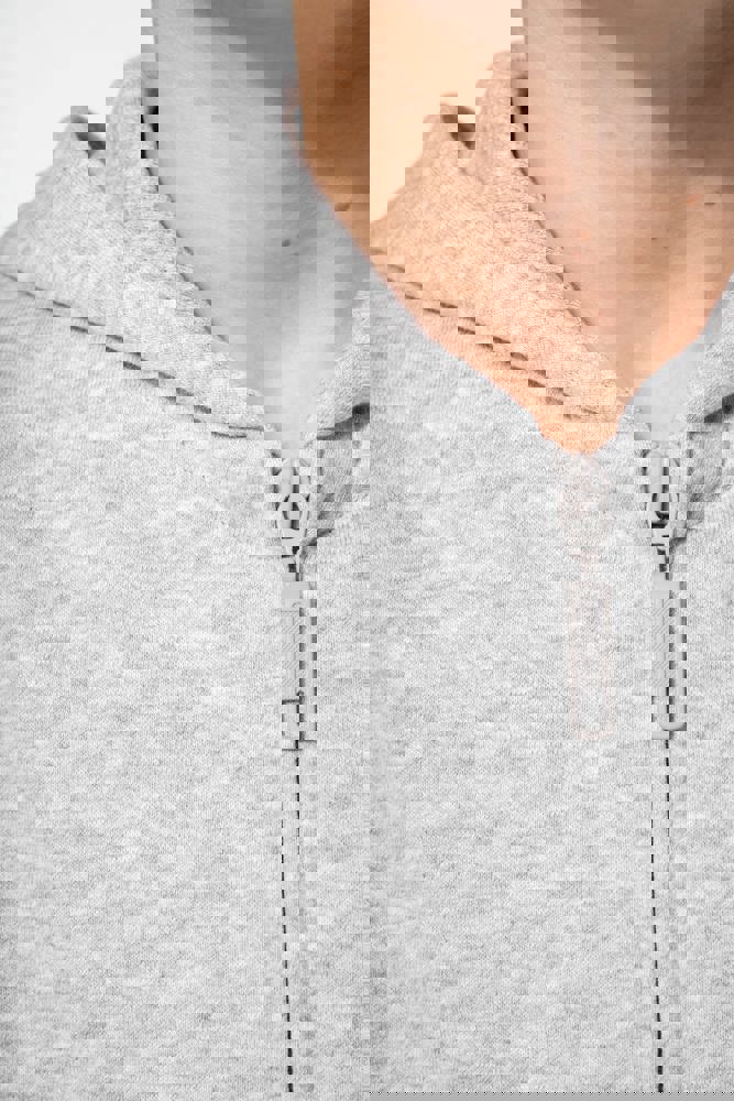 50% ringgesponnene Baumwolle / 50% recyceltes Post-Consumer-Polyester. Gebürstetes Molton. Gerader Schnitt. Geschnitten und genäht. Enzymwäsche. Schlauchförmige 2x1-Rippenbündchen für einen besseren Abschluss am Kragen, an den Ärmelenden und am Saum. Doppelte Ziernähte an Schultern, Armlöchern, unterem Saum und Ärmelabschluss. Kängurutaschen. Ton-in-Ton Nylon-Reißverschluss. Kapuze mit Jersey gefüttert. Ton-in-Ton-Jerseystreifen an der Innenseite des Kragens. Kein Markenetikett am Halsausschnitt, nur Größenangabe, zur einfacheren Veredelung.