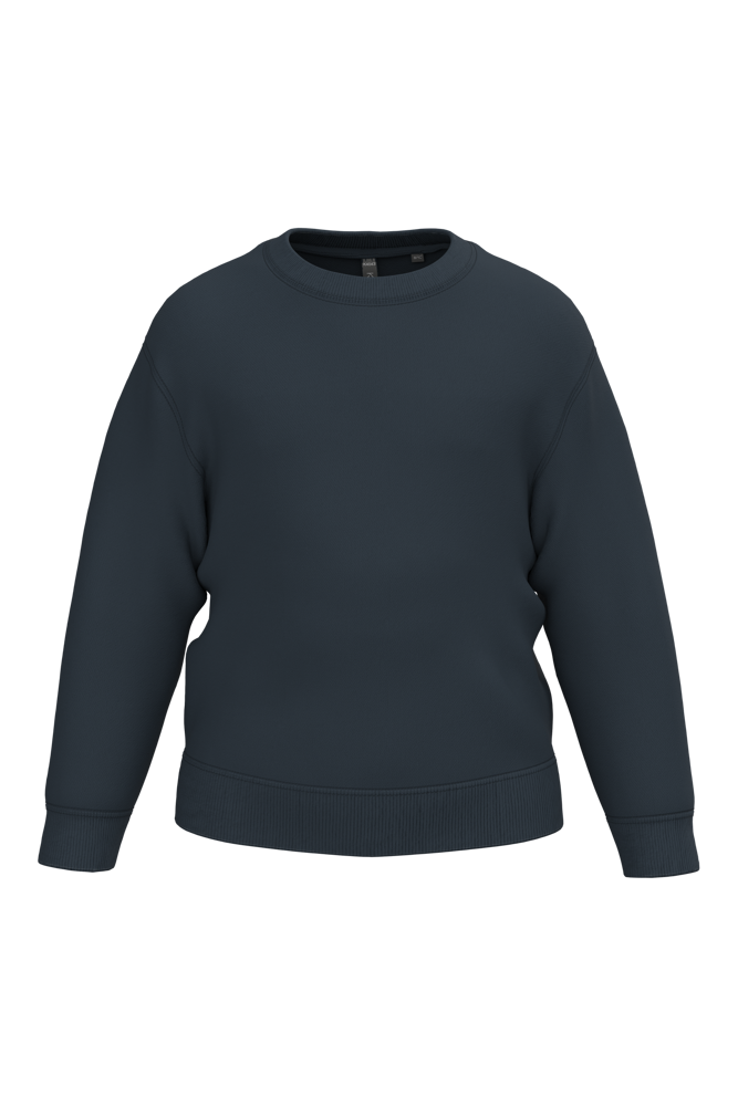 50% ringgesponnene Baumwolle / 50% recyceltes Post-Consumer-Polyester. Gebürstetes Molton. Gerader Schnitt. Geschnitten und genäht. Enzymwäsche. Schlauchförmige 2x1-Rippenbündchen für einen besseren Abschluss am Kragen, an den Ärmelenden und am Saum. Doppelte Ziernähte an Schultern, Armlöchern, unterem Saum und Ärmelabschluss. Ton-in-Ton-Jerseystreifen an der Innenseite des Kragens. Kein Markenetikett am Halsausschnitt, nur Größenangabe, zur einfacheren Veredelung.