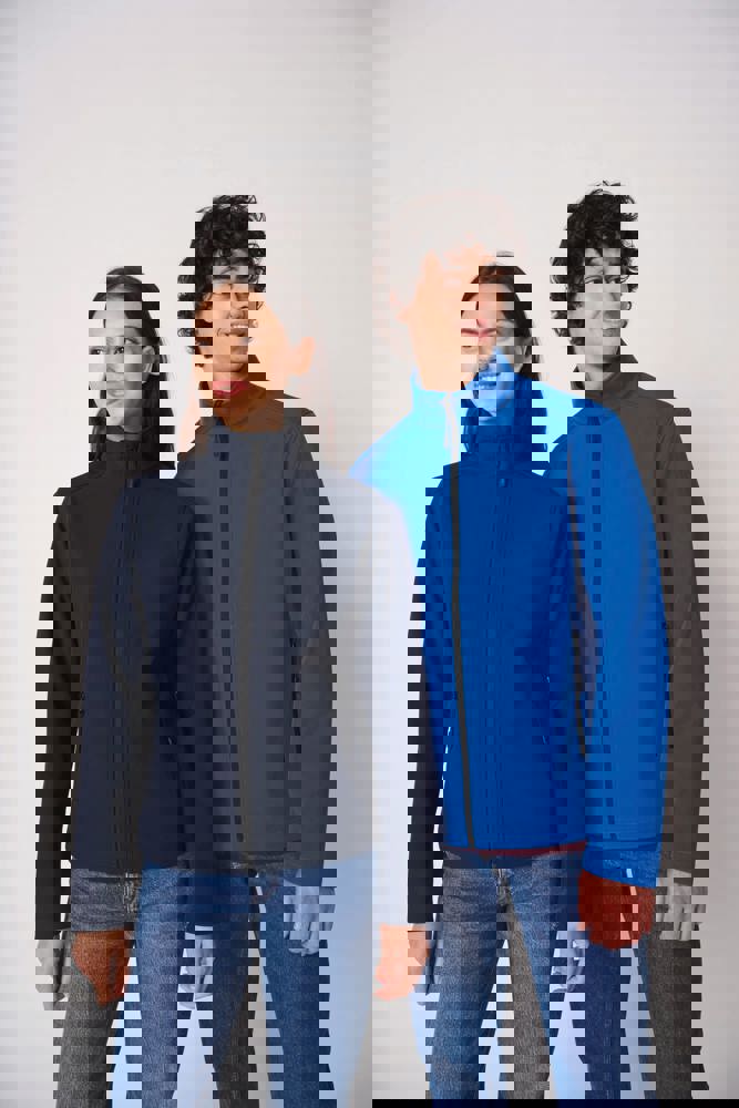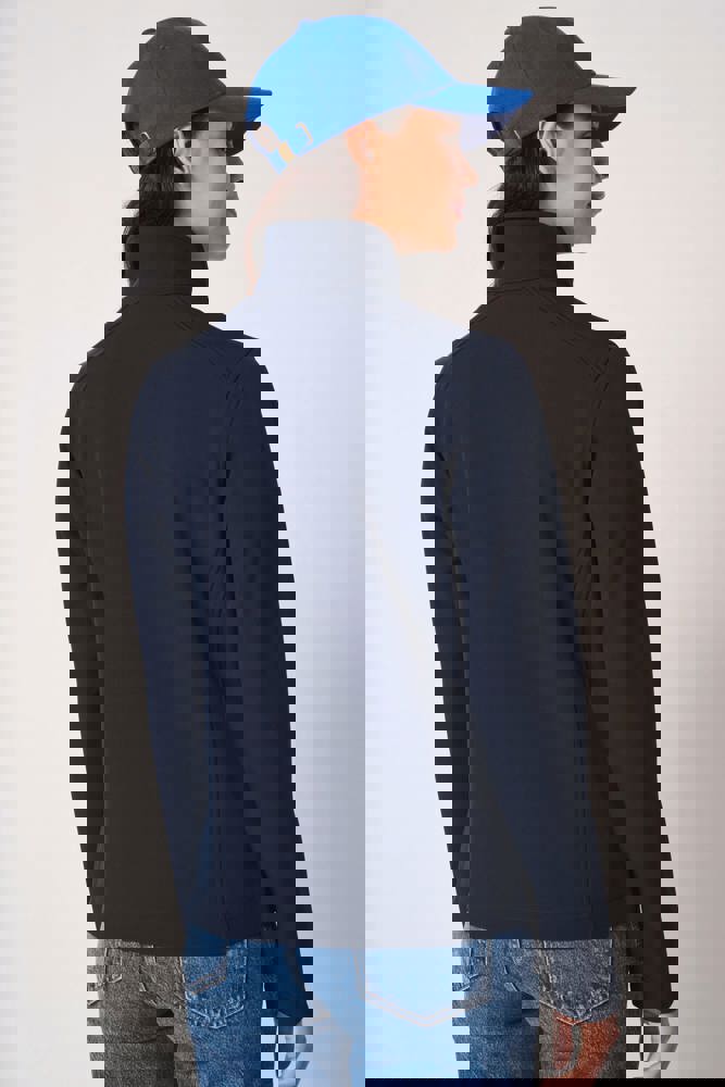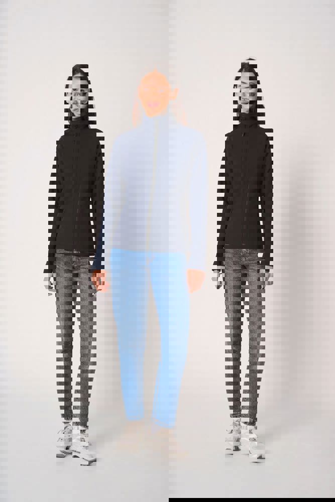 95 % Polyester / 5 % Elasthan. 2-Lagen-Softshell mit wasserabweisender Ausrüstung. Innen: 100 % Polyester in schwarzem Mikrofleece. Gerader Schnitt. Zwei Seitentaschen mit Polytrikot gefüttert, mit Nylon-Reißverschlüssen und schwarzen Reißverschlussanhängern. Schwarzer Nylon-Frontreißverschluss mit Kinnschutz und Zipper. Schulter- und Rückeneinsätze mit Ziernähten. Schwarzes Nackenband. Doppelnähte an Ärmel- und Saumabschlüssen. Abreißbares Markenetikett.