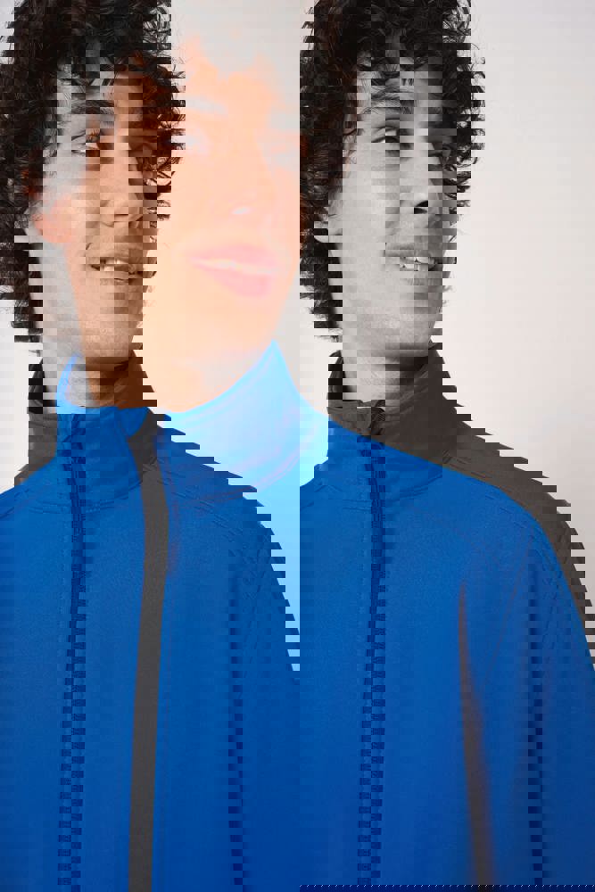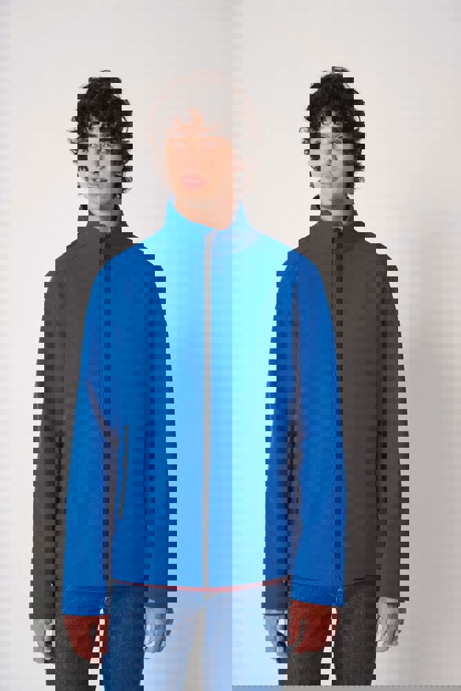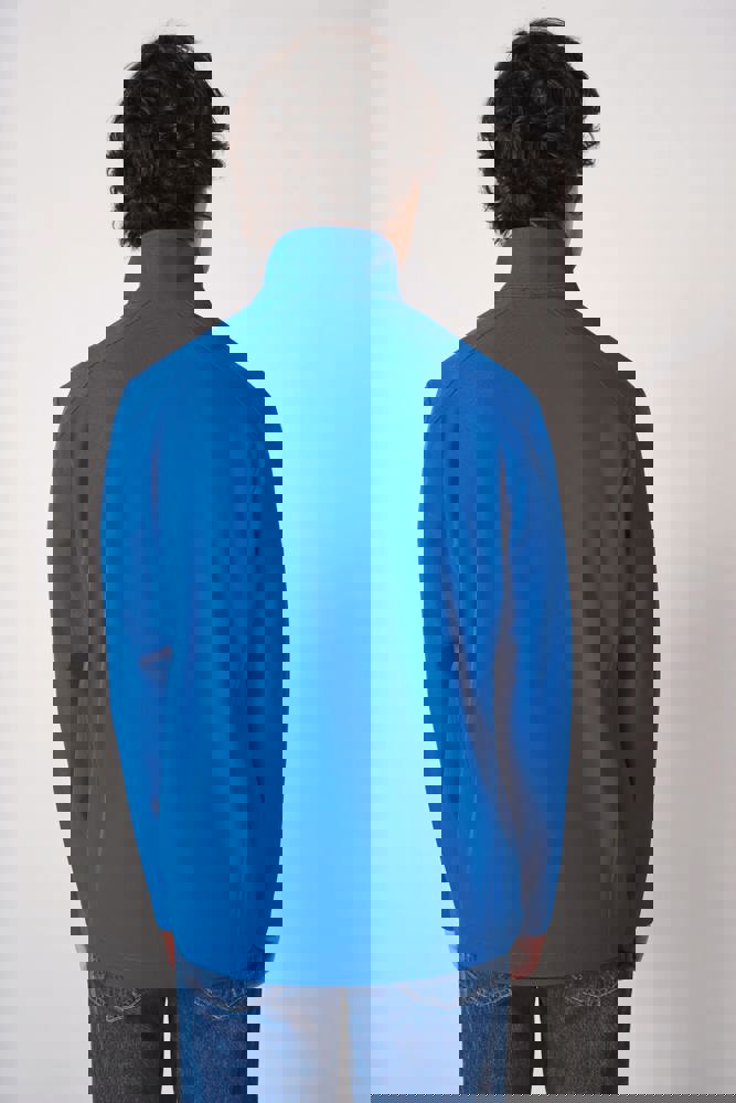95 % Polyester / 5 % Elasthan. 2-Lagen-Softshell mit wasserabweisender Ausrüstung. Innen: 100 % Polyester in schwarzem Mikrofleece. Gerader Schnitt. Stehkragen. Zwei Seitentaschen mit Polytrikot gefüttert, mit Nylon-Reißverschlüssen und schwarzen Reißverschlussanhängern. Schwarzer Nylon-Frontreißverschluss mit Kinnschutz und Zipper. Schulter- und Rückeneinsätze mit Ziernähten. Schwarzes Nackenband. Doppelnähte an Ärmel- und Saumabschlüssen. Abreißbares Markenetikett.