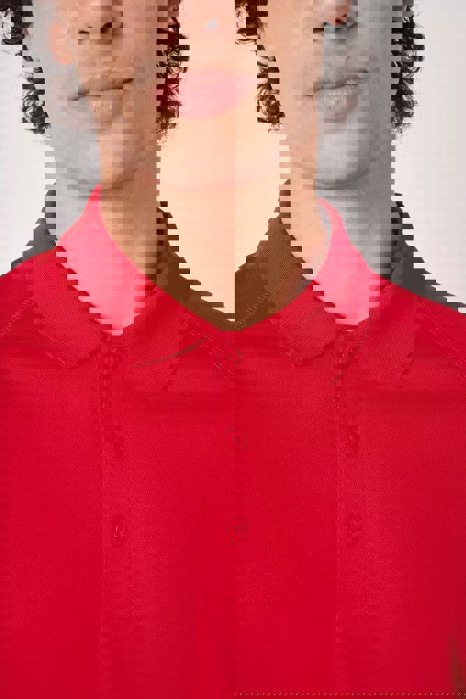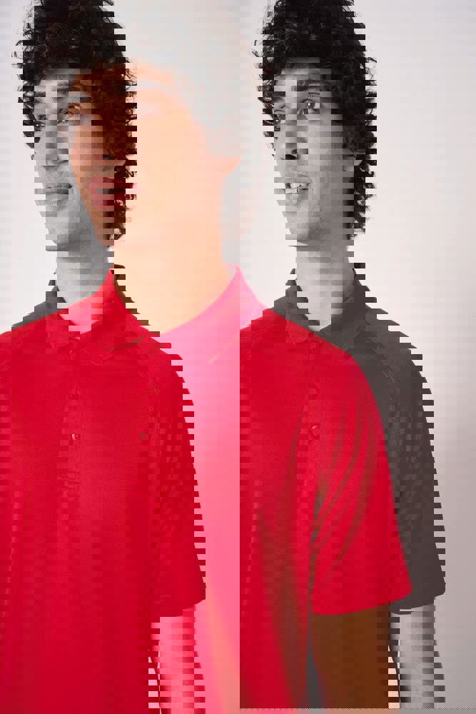 100 % Polyester. Piqué-Mesh-Gewebe. Leichtes, schnelltrocknendes Material. Gerader Schnitt. Raglanärmel mit Flatlocknähten. Kragen mit 1x1-Rippstrick. Knopfleiste mit 3 Ton-in-Ton-Knöpfen. Nackenband Ton-in-Ton. Doppelnähte an Ärmel- und Saumabschlüssen. Abreißbares Markenetikett.