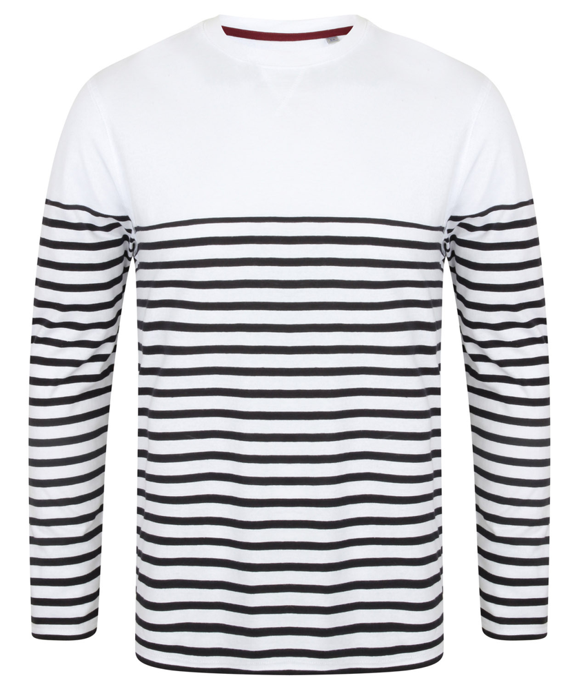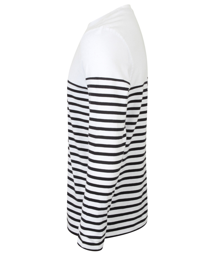 100 % Baumwoll-Jersey. Dickes Unisex-T-Shirt mit langen Ärmeln, klassischem Schnitt und ohne Etikett. Rundhalsausschnitt mit dehnbarem, geripptem Halsausschnitt. Saum und Ärmel mit Doppelziernaht. Flachnaht-Motiv in „V“-Form am Ausschnitt. Gestreiftes Unterteil.