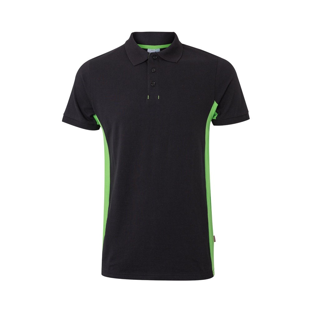 Two-tone piqué polo shirt (180g/m²), short sleeve, in cotton (60%) and polyester (40%). Mit Knopfverschluss, geripptem Kragen und unteren Ärmeln. Seiten und Knopfleiste in Kontrastfarbe. Größe: XS, S, M, L, XL, 2XL, 3XL