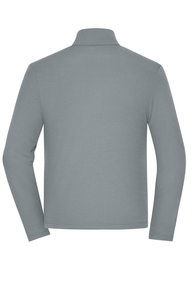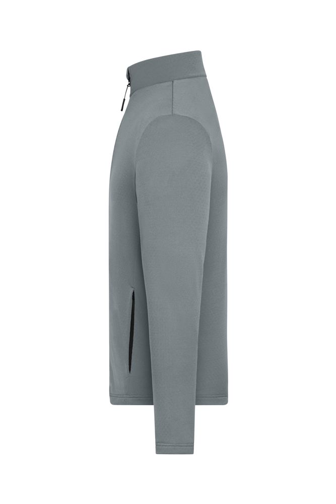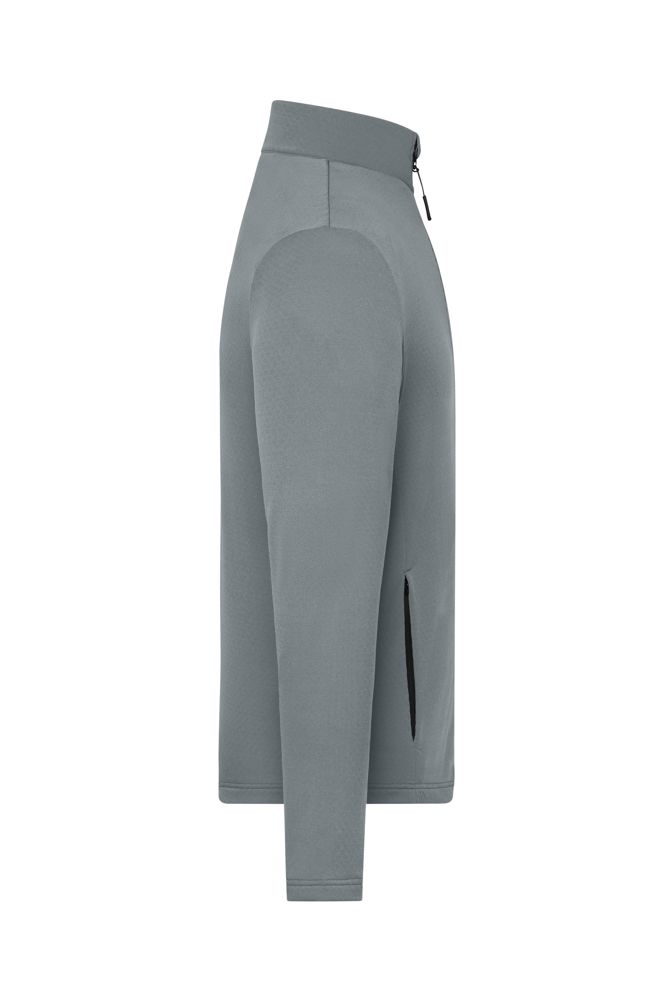 Angenehm weiche, bi-elastische Qualität Außenseite glatt, Innenseite mit strukturierter Fleeceoptik Durchgehend unterlegter Reißverschluss mit Kinnschutz 2 seitliche Taschen mit Reißverschluss Kontrastfarbige Reißverschlüsse Stehkragen JN1387: leicht tailliert 1/2 Oberweite: 50 cm 1/2 Saumweite: 49 cm Länge ab Schulter: 65 cm Ärmel Länge: 65 cm GRS Standard Stehkragen