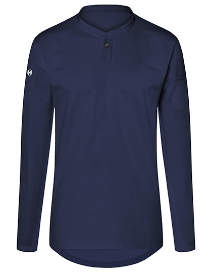 Vorderseite: Köpergewebe | Rückseite: Jersey-Piqué, atmungsaktiv, feuchtigkeitsregulierend | Lange Ärmel | Tailliert geschnitten | Halsausschnitt mit schmalem Stehkragen und kleiner Knopfleiste | Leistentasche am linkem Ärmel