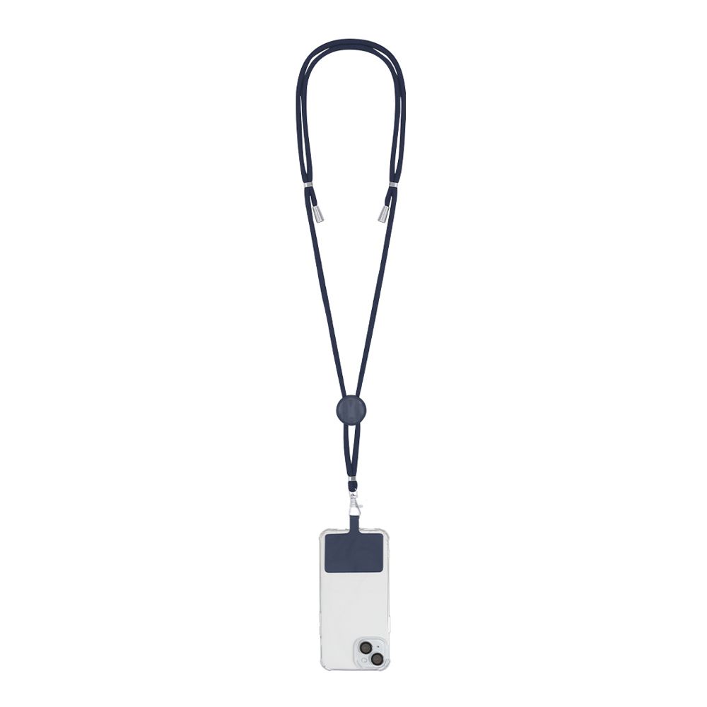 Lanyard mit Smartphone-Zubehör. Aus langlebigem Polyester gefertigt. Tragezubehör zum Platzieren zwischen Etui und Smartphone sowie Metallkarabiner. Kragenversteller, mit Chromdetails an den Enden der Kordeln.