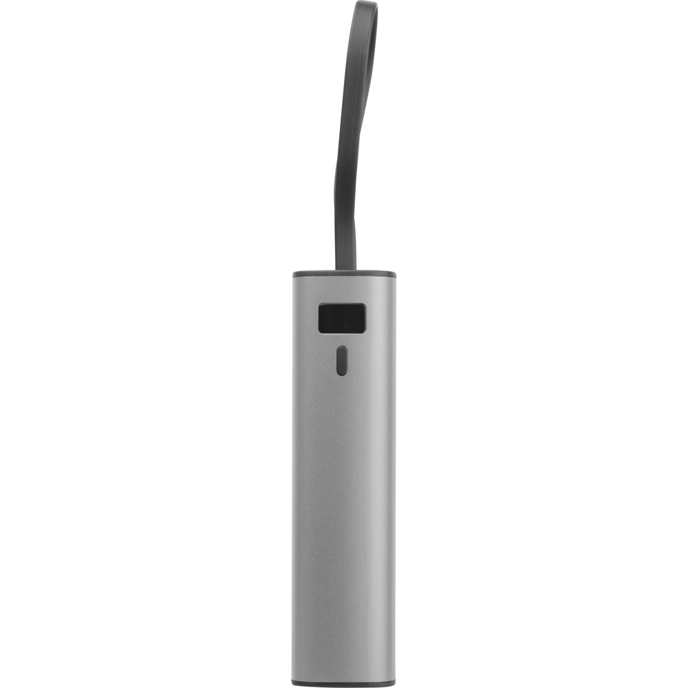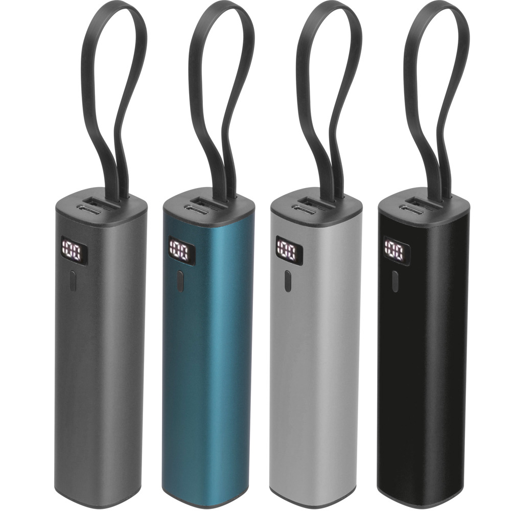 Powerbank aus Aluminium mit einem 5.000 mAh Li-Ionen-Akku, Ladestandsanzeige und integriertem USB-C Ladekabel. Ein 30 cm Ladekabel (Type A-C) ist im Lieferumfang inbegriffen. Ihre Werbung bringen wir mittels einer Lasergravur unterhalb des Displays an.