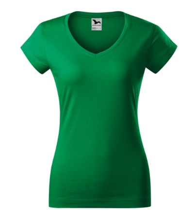 leicht taillierter Schnitt mit Seitennähten, vertiefter V-Ausschnitt, schmal geformter Kragensaum aus Materialfarbe mit 5 % Elastanzugabe, Innenseite des Kragens durch ein Band in T-Shirt Material versäubert, Schulternähte verstärkt mit einem Band, Ärmel der kürzeren Länge, Silikonbearbeitung